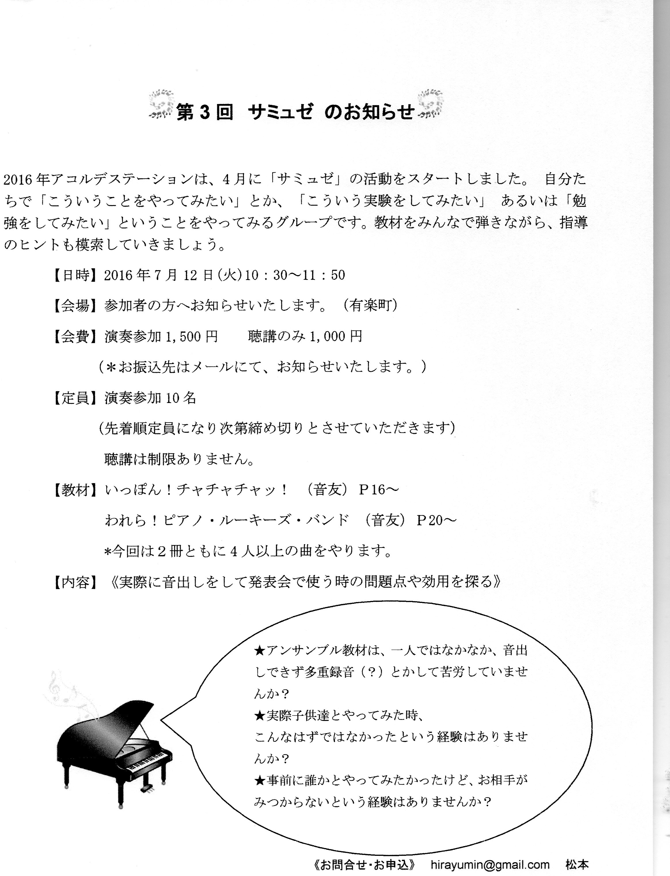 さて、来週は第3回目のサミュゼが7月12日に開催されます。こちらは講師がいるわけではなく、みんなで弾き合う会です。今回は、「われら!ルーキーズ・バンドP20~」「いっぽん!チャッチャッチャッ!P16~」です。