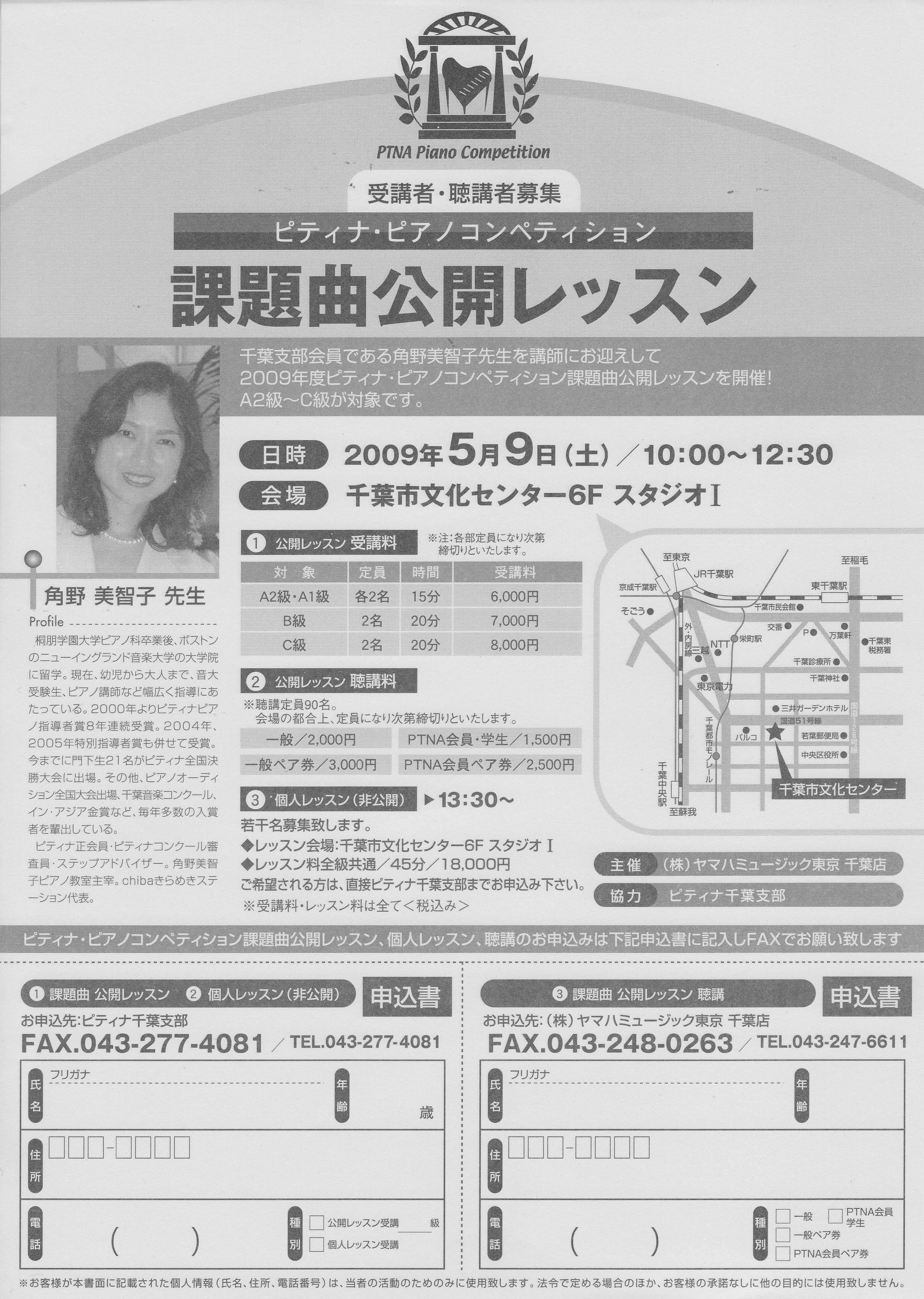 2009年ピティナピアノコンペティション課題曲公開レッスン&個人レッスンの詳細が決定致しましたのでお知らせ致します。 【お問合先】 ヤマハ千葉店 TEL043-247-6611 千葉支部 (由良方) TEL043-277-4081