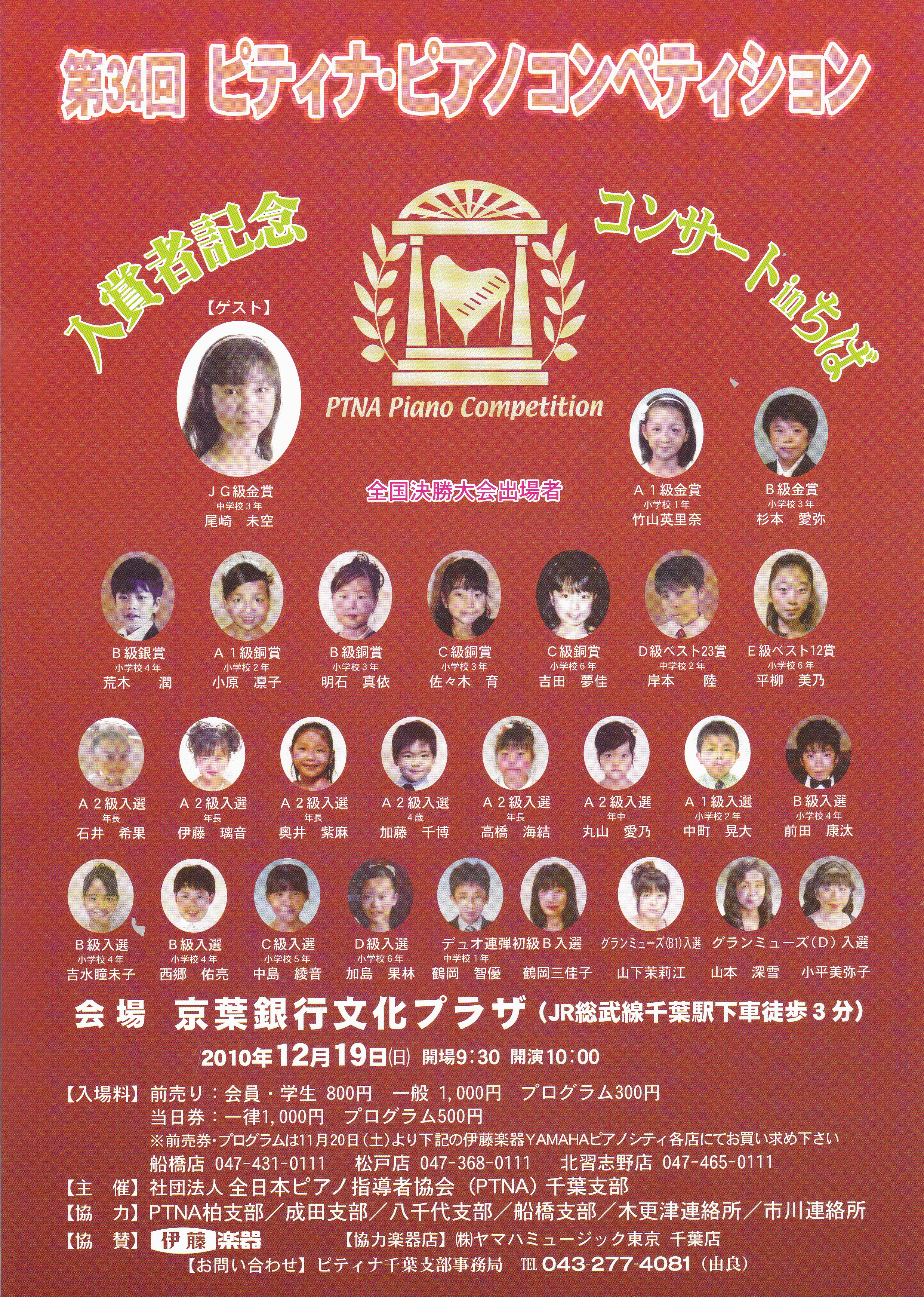 ここに当日の級別のタイムスケジュールを掲載致します。 ゲストにはJr.G級金賞の尾崎未空さ んを迎えております。 2002年12月の第3回目のこのコンサートには、当時中2のお兄様の尾崎有飛さんをゲストにお迎えしており、本年は妹さんと、兄妹そろってのゲストとなりました。