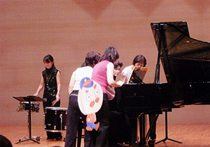 私たちスタッフもこの機会に春畑先生の曲を勉強させていただこうと、リレー連弾や打楽器とのアンサンブルなど合計 6 チームが参加しました。「楽しさが伝わるように!」を合言葉に、少々 (?) のパフォーマンスも加えながら本番に臨みました。春畑先生には的確なアドバイスをいただき、他のアドバイザーの先生方には「本当に楽しそうで、私も参加したかったです。」などのお言葉をいただき、とても感激したと同時に、私たちの思いは客席にお伝えすることができたかな、と自負しています。